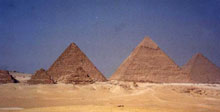 Визитная карточка" Египта - пирамиды. Пирамид здесь около сотни - больших и маленьких, ступенчатых и с гладкими боками, дошедших до нас почти в неизменном виде и больше похожих на бесформенную груду камней. Они расположены вдоль левого, западного берега Нила небольшими группами, неподалеку от того места, где в эпоху Древнего царства находилась столица страны - Мемфис. Самые известные из пирамид - на окраине Каира, на кромке пустынного плато Гиза, нависшего над зеленой долиной Нила. Здесь, в Гизе, и стоят три великие пирамиды - Хеопса, Хефрена и Микерина.